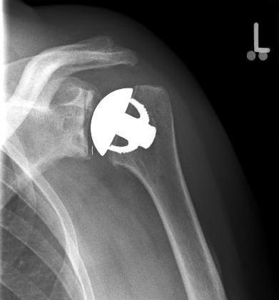 Right: radiograph of an inverse shoulder prosthesis for rotator cuff defect arthropathy.