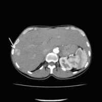 Computertomographische Darstellung eines hepatozellulären Karzinoms (Pfeil) (Bild 1 von 5) Vorwärts »